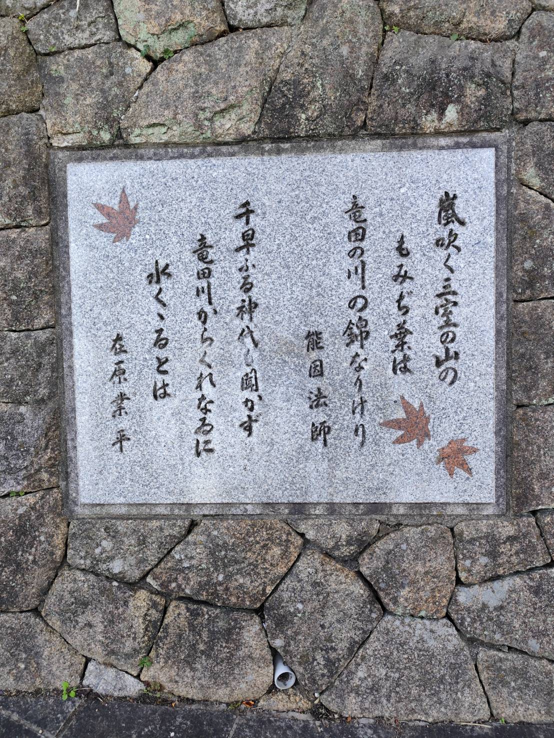 各地で紅葉が見頃でございます。当ステーション横の高田川沿い遊歩道も紅葉が綺麗です。訪問道中は、景色を見ながら束の間の秋を楽しんでおります。私の自宅周辺、竜田川沿いも紅葉が綺麗です。遊歩道に平安時代の歌人、小倉百人一首で有名な在原業平の歌碑があります。