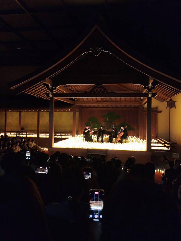 先日、クラシック音楽のコンサートに行ってきました。家族がジブリ作品が好きで、聴き馴染みのある名シーンの音楽を手掛けてきた久石譲の音楽が生演奏で聴けるとあって会場に向かいました。会場は大阪城近くにある「大槻能楽堂」。昭和10年に創立された能舞台がある歴史ある能楽堂です。能以外でも様々な公演や発表会が開催されています。会場に入ると、数千のキャンドルが置かれ、キャンドルの灯りに照らされた能会場。和と洋が融合した会場に弦楽四重奏のミュージシャンが演奏します。普段、クラシック音楽に馴染みがありませんが能楽堂で聴くクラシック音楽は初心者でも親しみやすくとてもリラックスした状態でジブリ音楽が楽しめました。キャンドルの優しい灯りと和の空間、ず〜っと眠い状態、日々バタバタと気忙しくしている心と身体を癒してくれました。
